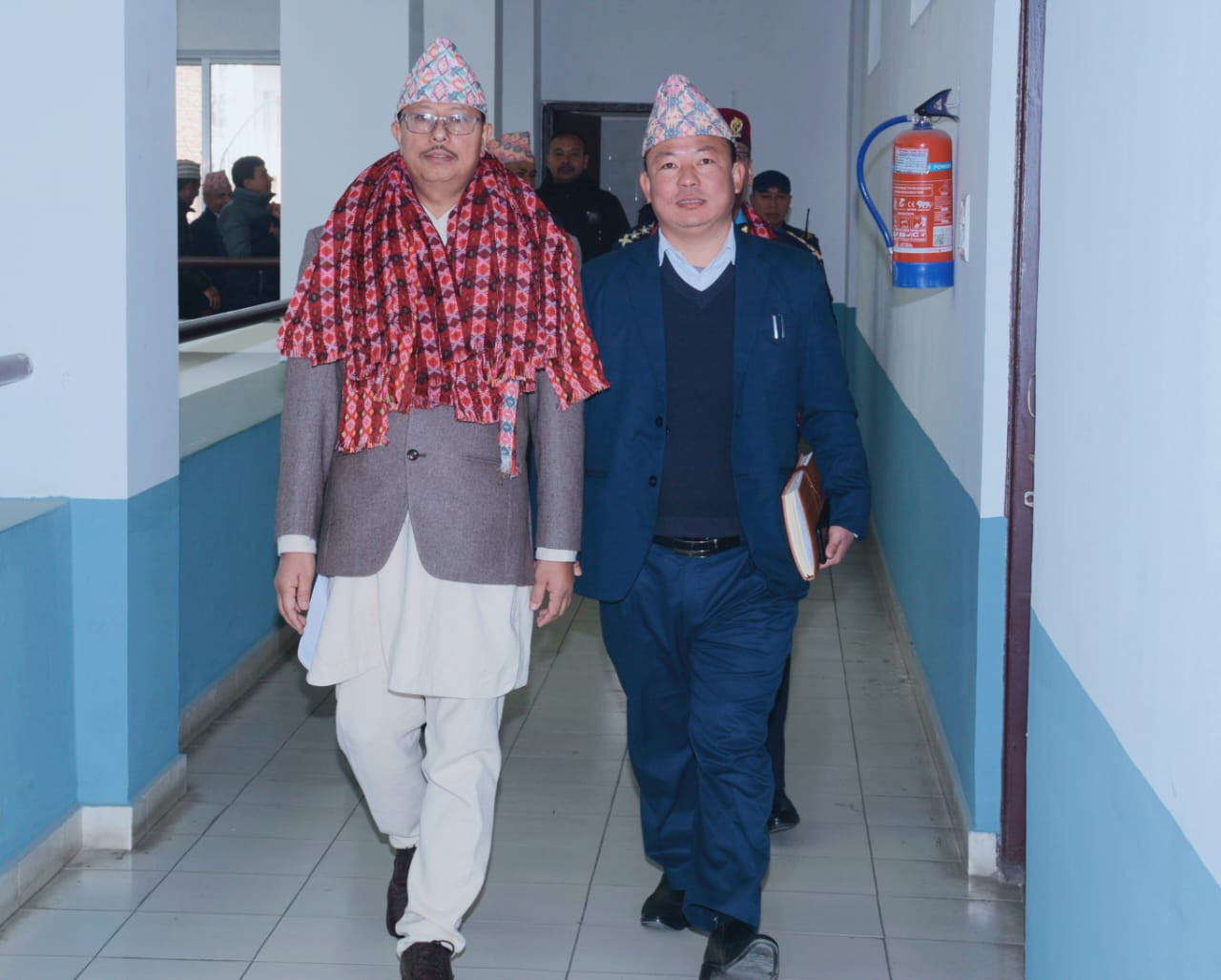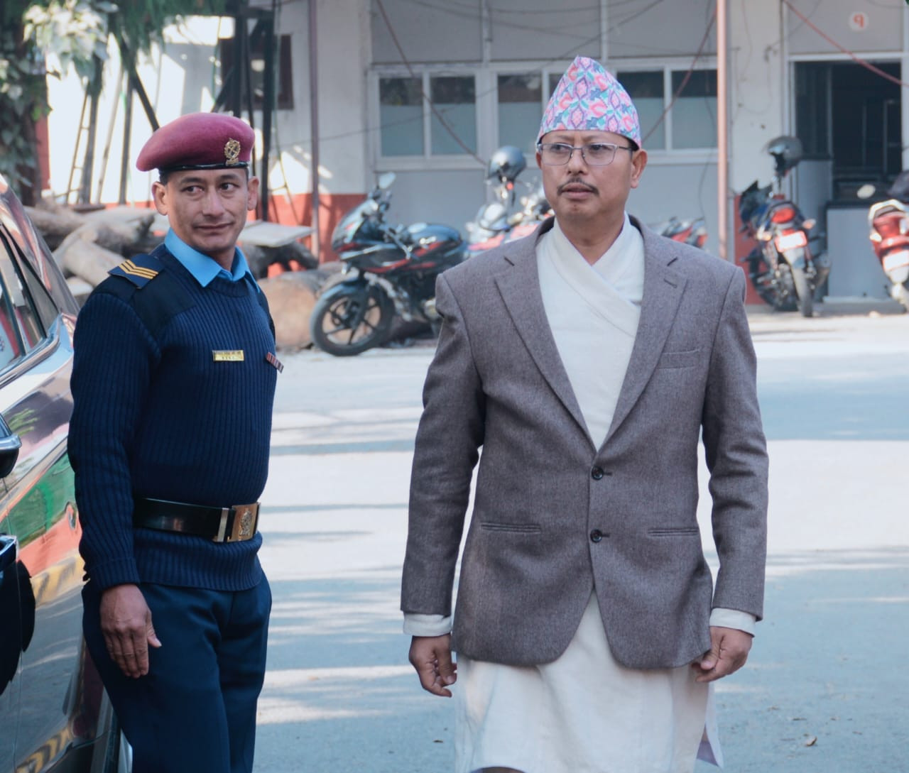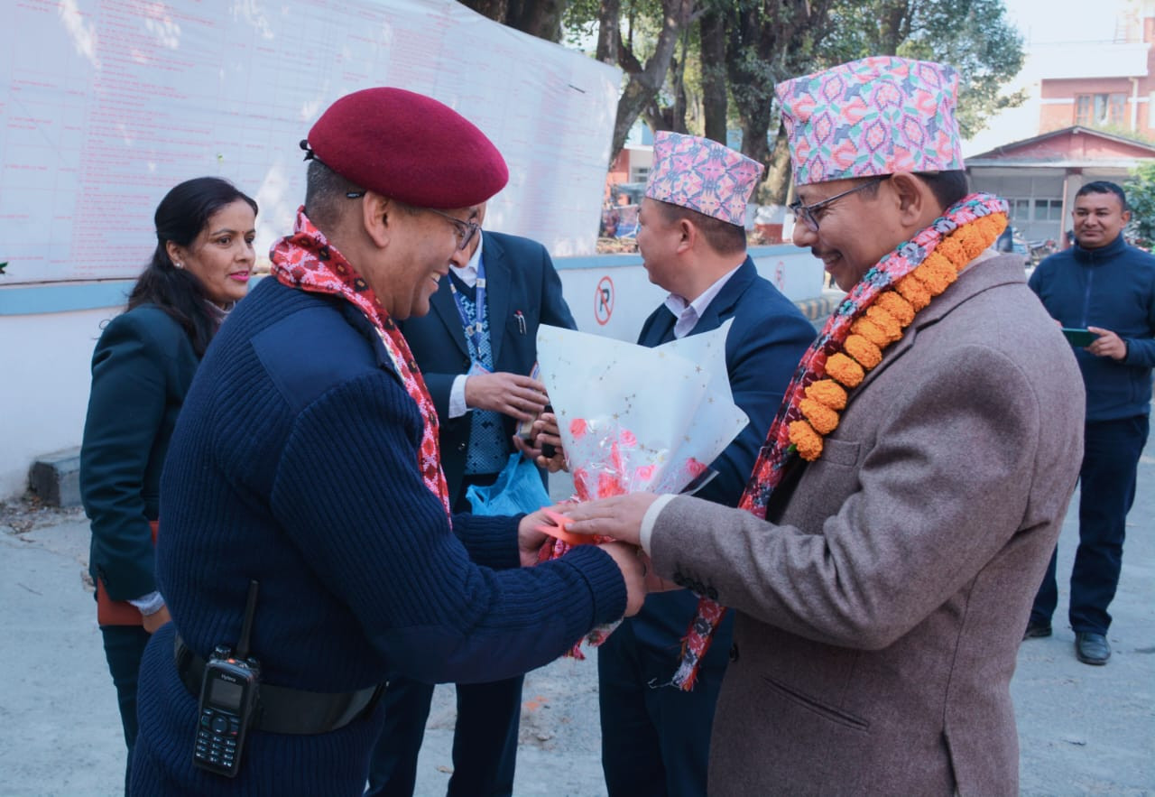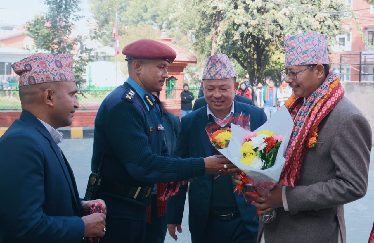 प्रमुख जिल्ला अधिकारी श्री तुलसी बहादुर श्रेष्ठज्यूलाई कार्यालय परिसरमा स्वागत गर्दै प्रहरी बरिष्ठ उपरीक्षक शेखर खनालज्यू र सहायक प्रमुख जिल्ला अधिकारी अमर दिप सुनुवार