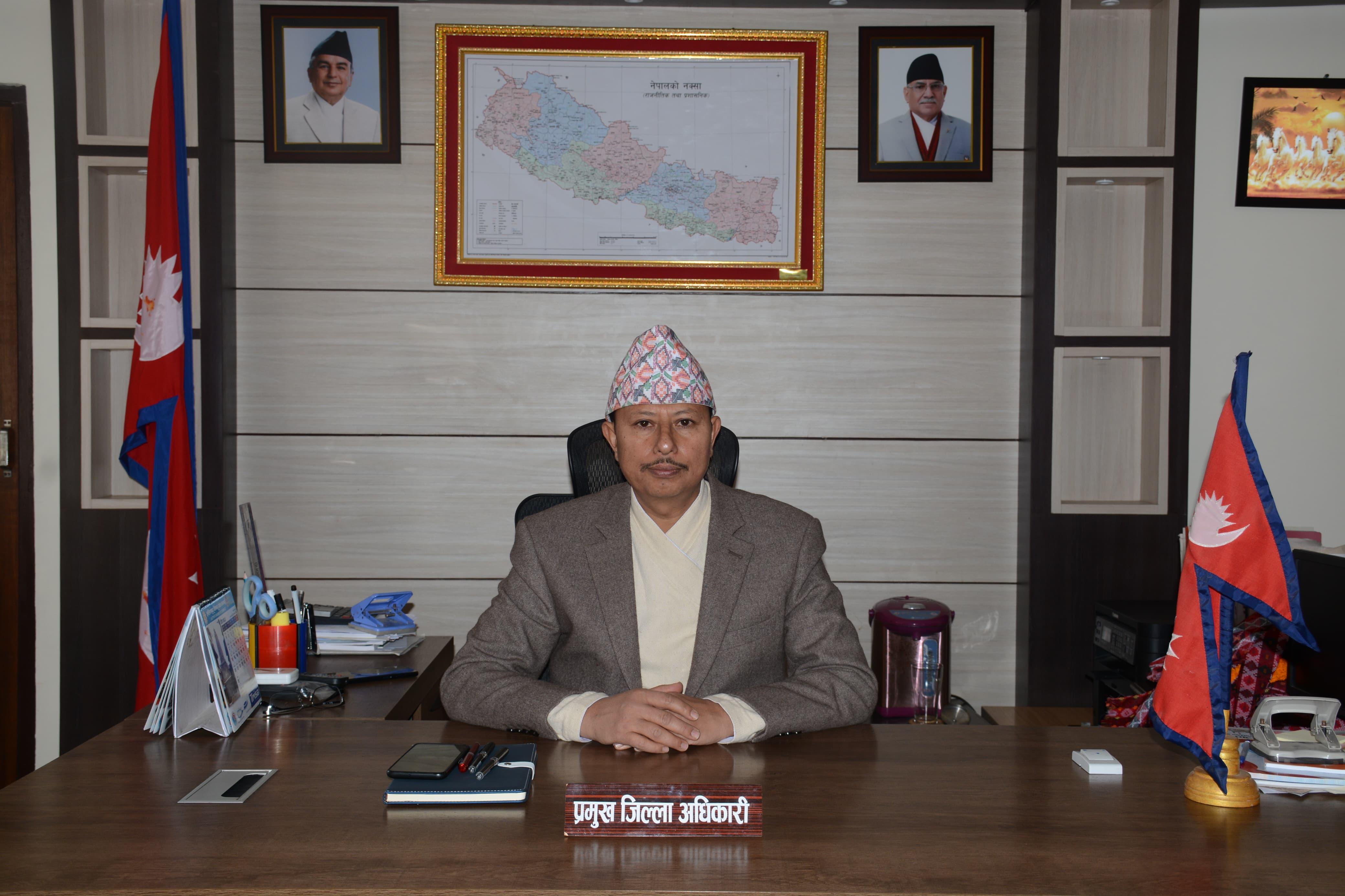मिति २०८१ साल पौष १ गते प्रमुख जिल्ला अधिकारी श्री रमेश ढकालज्यूको अध्यक्षतामा स्थानीय तहका प्रमुख, जिल्लामा क्रियाशिल राजनीतिक दलका प्रतिनिधि र विपद्सँग सम्बन्धित कार्यालय प्रमुखहरुको उपस्थितिमा जिल्ला विपद् व्यवस्थापन समितिको बैठक सम्पन्न