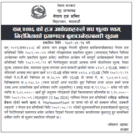 सन् २०२६ को हज आवेदकहरुले थप शुल्क एवम् निरोगिताको प्रमाणपत्र बुझाउने सम्बन्धी सूचना